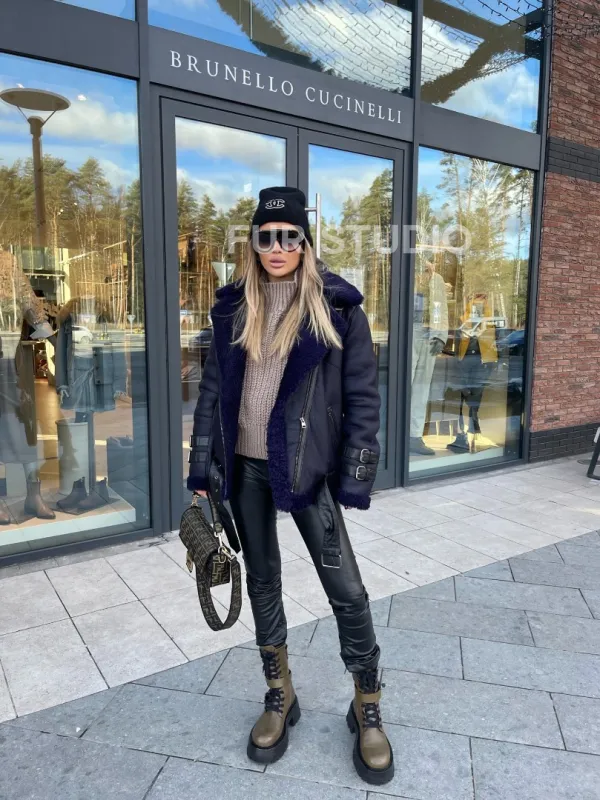 Натуральная овчина позаботится о комфортной температуре тела в любую непогоду и холода. Широкие рукава не сковывают движения, что очень удобно для тех, кто водит машину. Добавьте в образ стильный рюкзак и грубые ботинки - будете выглядеть дерзко, но очень женственно. Купить авиатор из натуральной овчины в синем цвете могут девушки, которые следят за модой и не боятся экспериментировать.