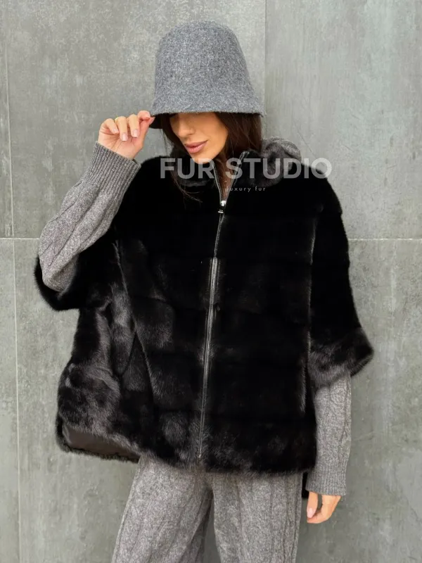 Мех данной шубы аукционная норка , цвет черный. Предлагается в размерах от 40 до 48 (oversize). Длина модели 60-65 см, что выгодно подчеркивает фигуру девушек. Эта модель идеально подойдет для девушек и женщин, предпочитающих роскошные натуральные меха.
