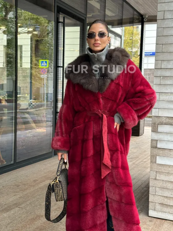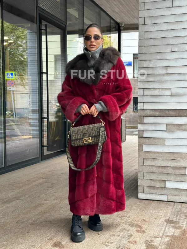Мех данной шубы аукционная норка, цвет бордовый. Предлагается в размерах от 40 до 50. Длина модели 125-130 см, что выгодно подчеркивает фигуру девушек. Эта модель идеально подойдет для девушек и женщин, предпочитающих роскошные натуральные меха.