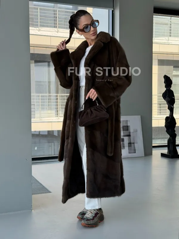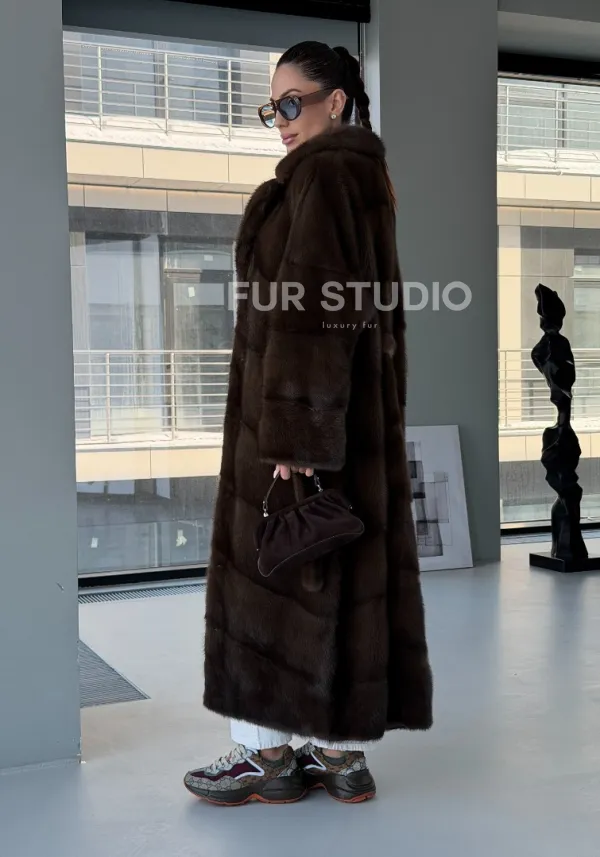 Мех данной шубы аукционная норка, цвет коричневый. Предлагается в размерах от 42 до 54. Длина модели 125-130 см, что выгодно подчеркивает фигуру девушек. Эта модель идеально подойдет для девушек и женщин, предпочитающих роскошные натуральные меха.