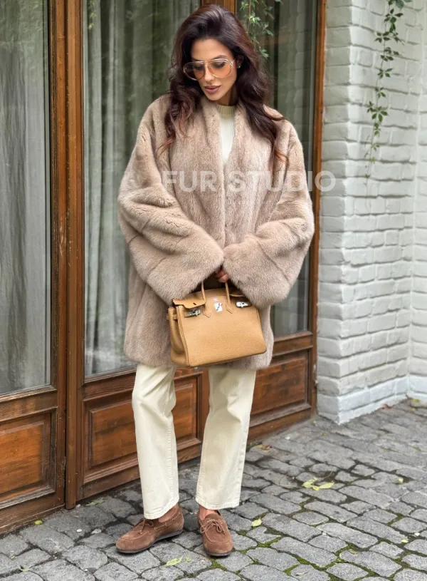 Мех данной шубы аукционная норка, цвет бежевый. Предлагается в размерах от 42 до 54. Длина модели 75-80 см, что выгодно подчеркивает фигуру девушек. Эта модель идеально подойдет для девушек и женщин, предпочитающих роскошные натуральные меха.