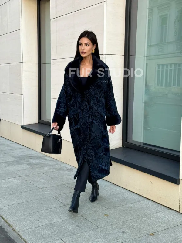 Шуба из каракуля Indigo Blue с отделкой из меха норки, фасон кокон доступна для покупки в нашем шоуруме Furs Studio в . У нас так же есть доставка во все города России. Добавьте немного роскоши в свой гардероб с этой шубой, которая будет служить вам многие годы.
