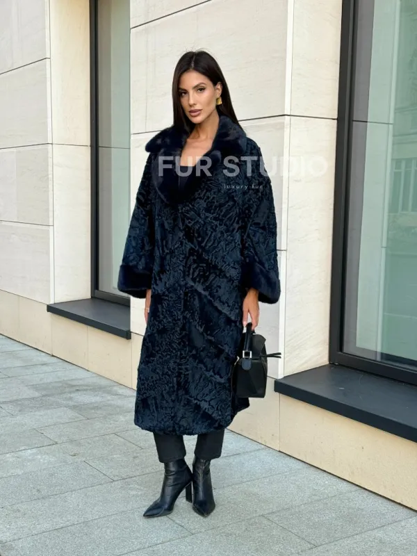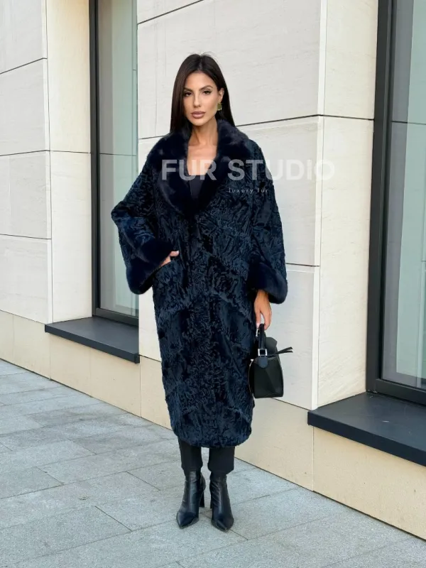 Шуба из каракуля Indigo Blue с отделкой из меха норки, фасон кокон 101105