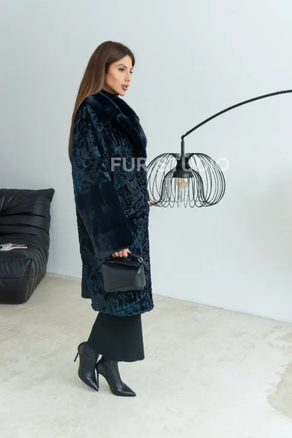 Шуба из каракульчи с английским воротником норки - цвет темно-синий 100188