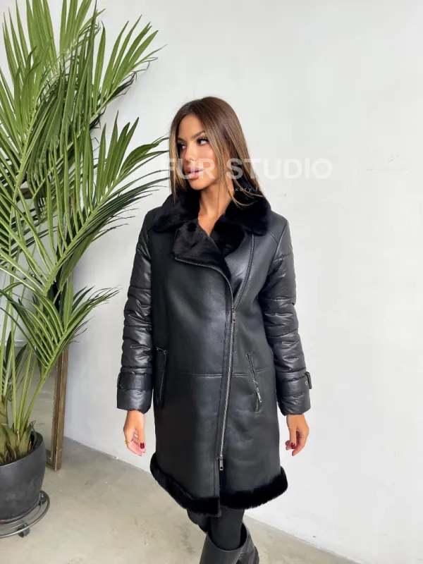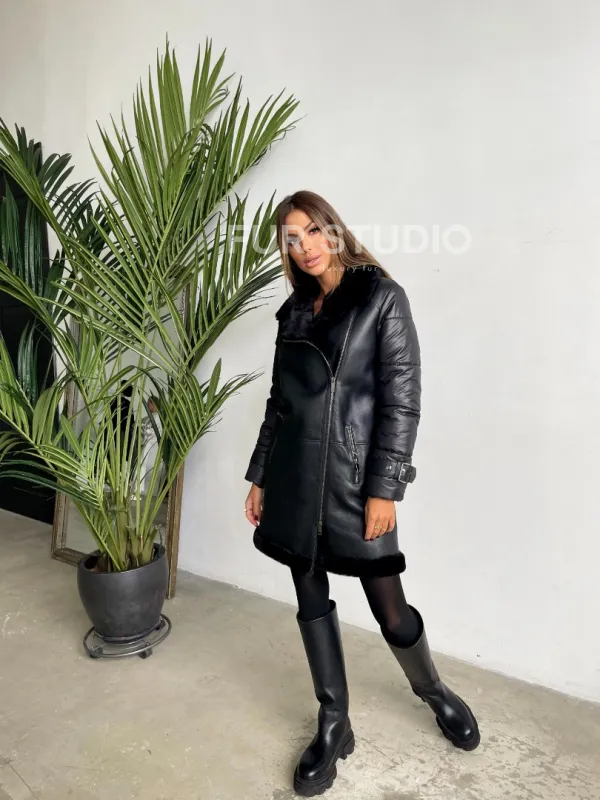 Удлиненная черная дубленка авиатор 102125