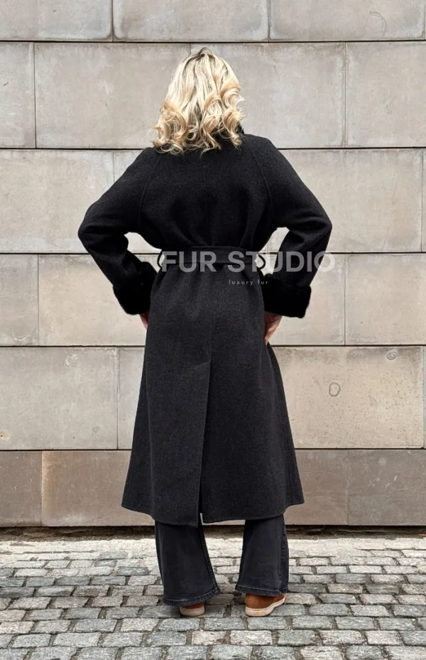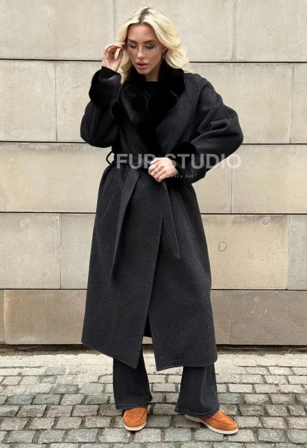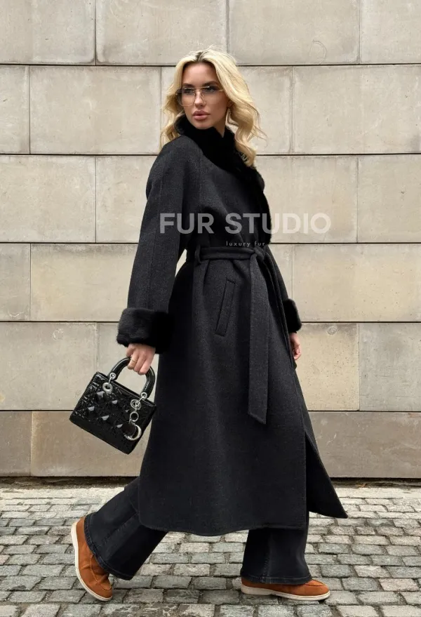 Женское демисезонное шерстяное пальто-халат с отделкой из меха норки 101808
